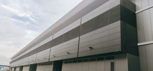 除了多種巧妙的防水設(shè)計(jì)之外,項(xiàng)目幕墻組還在本身就具備防水性能的所有鋁板和室外可視型材上進(jìn)行了厚度不小于45微米的氟碳噴涂處理三涂,專門為這座超級展館增加一層防蝕護(hù)甲。