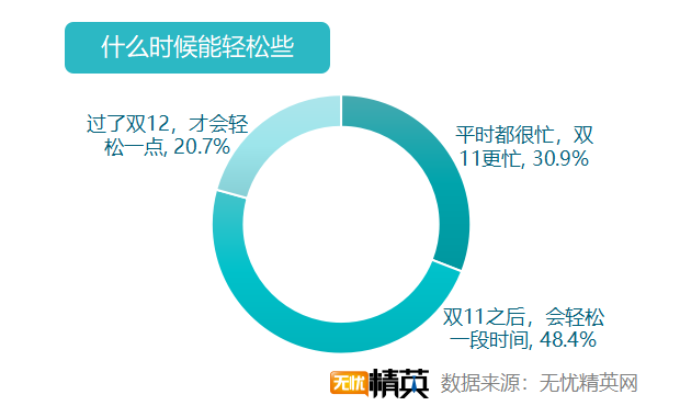 忙碌是工作的常態(tài),雙11只是更忙一點(diǎn)罷了。48.4%的受訪者表示雙11以后,會(huì)輕松一段時(shí)間;30.9%的職場(chǎng)精英表示,平時(shí)都很忙,只是雙11更加忙碌罷了;而20.7%的人,要過了雙十二才會(huì)輕松一點(diǎn)。年底的市場(chǎng),一直是商家們的戰(zhàn)場(chǎng),雙11以后,雙12、圣誕節(jié)、元旦、春節(jié)接踵而至,輕松只是短暫的停留,促銷才是長(zhǎng)期的工作。
