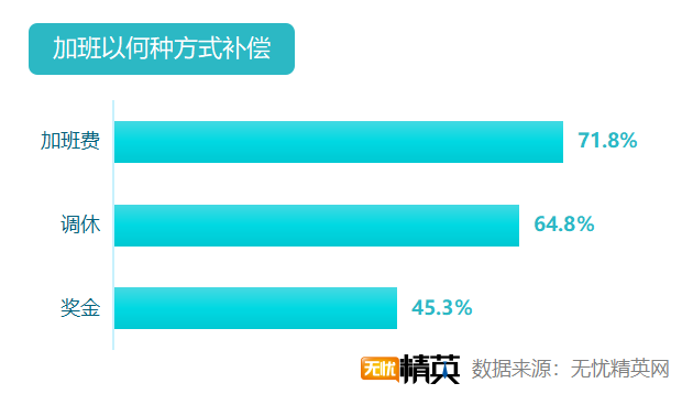 幾乎所有雙11加班的職場(chǎng)精英都能獲加班補(bǔ)償,更有31.4%人能獲得兩項(xiàng)或更多的補(bǔ)償。71.8%的職場(chǎng)精英可以獲得加班費(fèi);64.8%的人獲得調(diào)休;45.3%的人會(huì)獲得額外的獎(jiǎng)金。