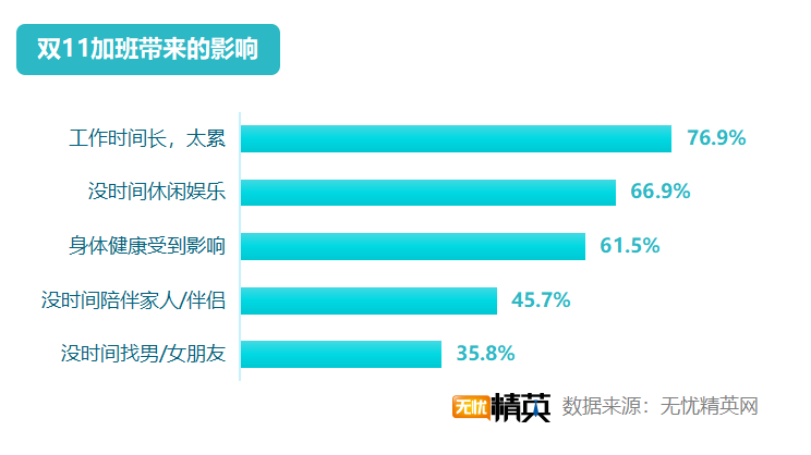 雙11高強(qiáng)度的加班,導(dǎo)致職場(chǎng)精英們的生活受到較大影響,76.9 %的人因?yàn)楣ぷ鲿r(shí)間過長(zhǎng),覺得太累;66.9 %的人因?yàn)榧影鄾]有時(shí)間休閑娛樂;61.5 %的人身體健康帶來影響;45.7 %的人沒時(shí)間陪伴家人/伴侶;更有35.8 %的人,將沒有男朋友/女朋友的鍋,扣到了雙11的頭上。