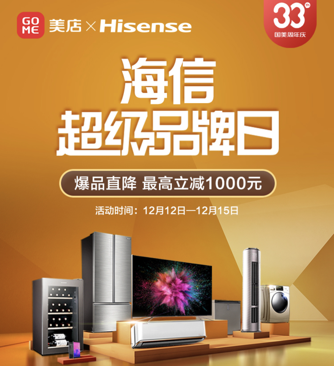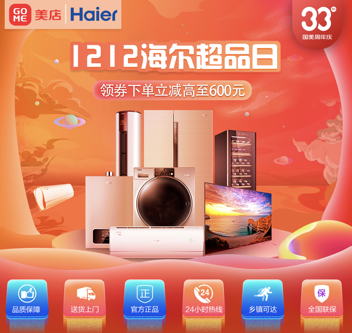 12月12日-15日,33周年生日之際,國美與海爾再度攜手,國美美店帶來海爾超級品牌日活動,涵蓋了海爾冰箱、洗衣機、空調(diào)、電視、廚房衛(wèi)浴等多個品類豐富產(chǎn)品,多重優(yōu)惠福利、六大承諾保障、延保清洗服務。