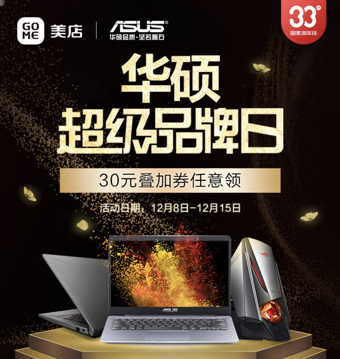 國美33周年華碩超級品牌日,游戲、辦公、輕薄顏值筆記本電腦應有盡有,全場產(chǎn)品可領(lǐng)30元無門檻可疊加優(yōu)惠券,相當于在原有優(yōu)惠基礎上再降30元。