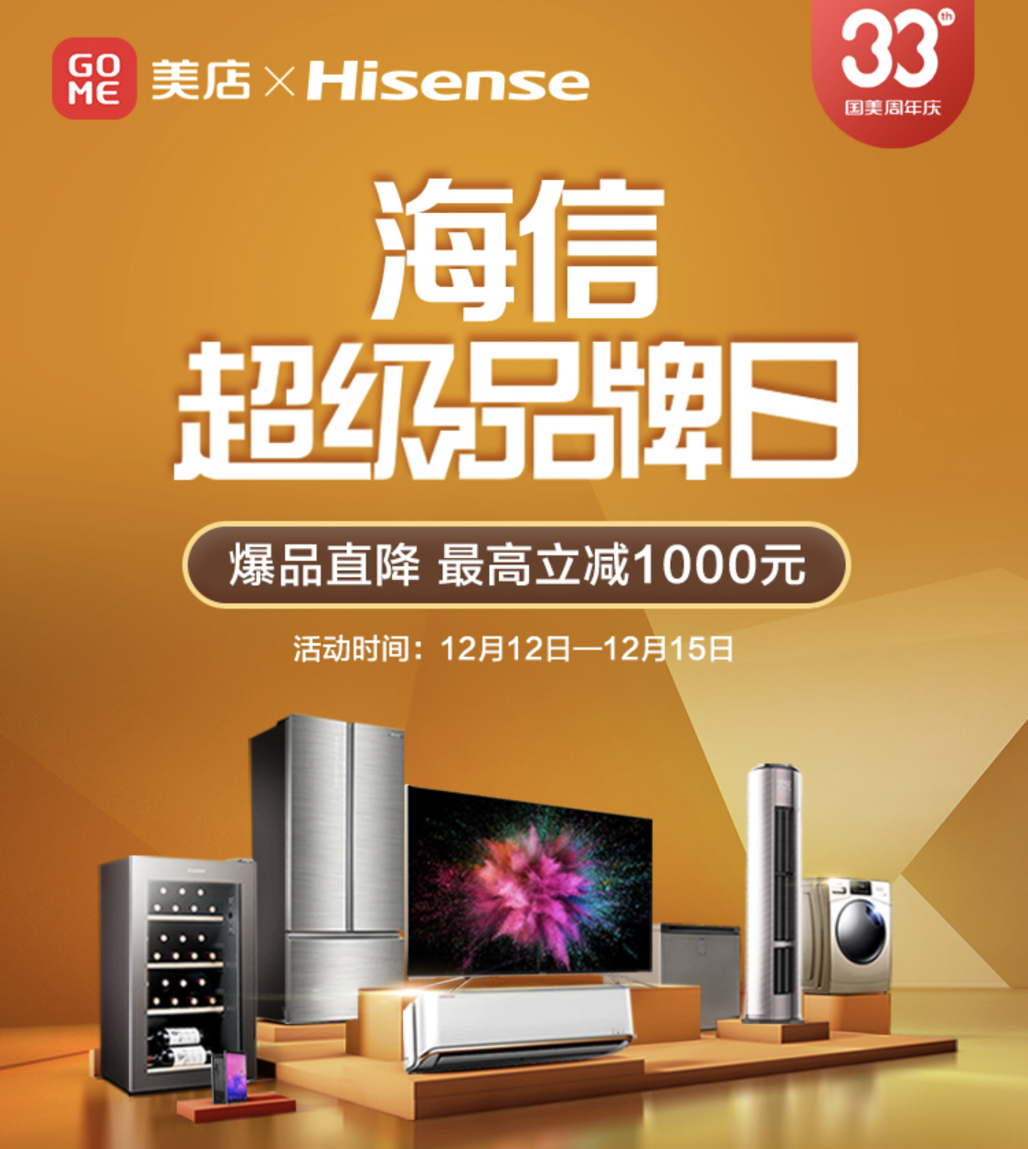 深圳新聞網(wǎng)2019年12月12日訊 12月12日-15日,國(guó)美33周年慶活動(dòng)已經(jīng)啟動(dòng),屆時(shí)消費(fèi)者可在深圳國(guó)美門店參與“全場(chǎng)好物,第二件5折起”活動(dòng)。同時(shí),海信、海爾、美的超級(jí)品牌日活動(dòng)也將于12日-15日期間在國(guó)美美店展開。用戶在國(guó)美APP中美店活動(dòng)專區(qū)便可參與到活動(dòng)中來(lái),下面為大家介紹下本次海信超級(jí)品牌日的重磅爆品,全場(chǎng)最高立減1000元,還有機(jī)會(huì)獲得愛奇藝四端VIP會(huì)員卡和小度音箱等福利獎(jiǎng)品,不要錯(cuò)過。