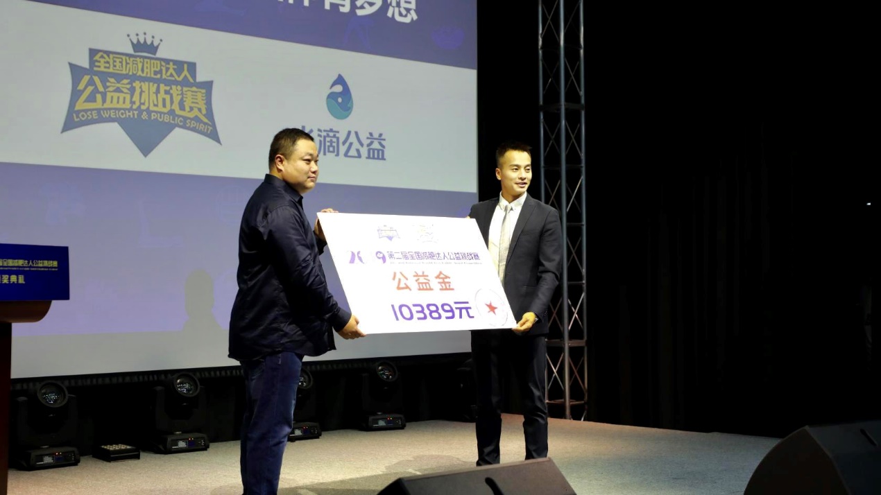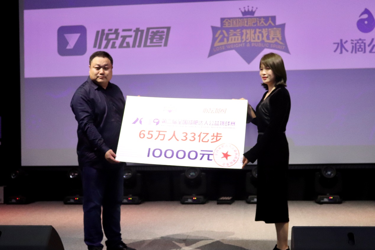 典禮上賽事組委會還履行“一斤脂肪,一元愛心”的賽事公益承諾,在頒獎典禮上舉行了隆重的賽事公益金捐贈儀式。賽事最終公益金累計20389元(其中本屆賽事累計減重10389斤,悅動圈平臺累計65萬人線上參與步數(shù)捐贈活動),公益金將如數(shù)捐獻于賽事公益合作伙伴——水滴公益匯聚基金會,由水滴公益將賽事公益金致力于“心愿清單”圓夢山區(qū)兒童校園體育夢想計劃。