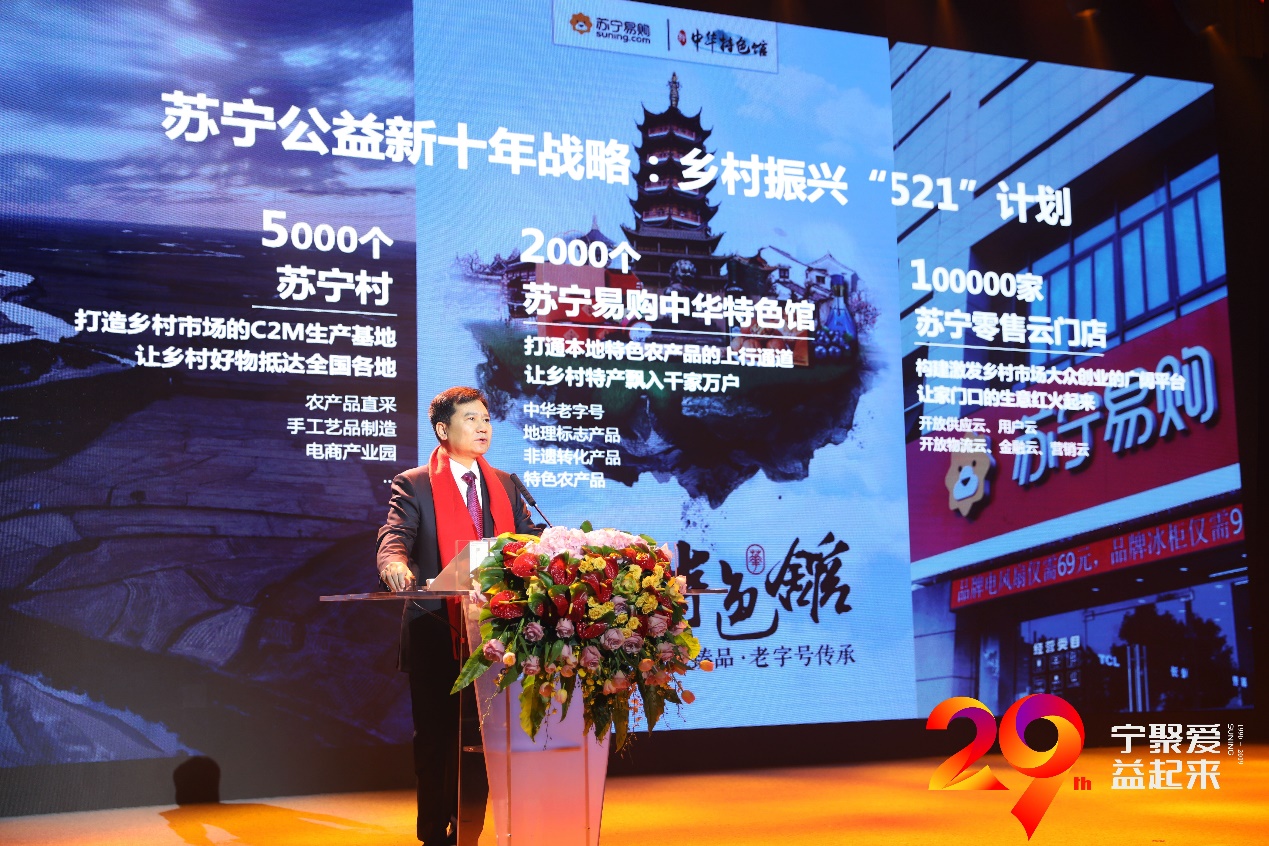 (圖:蘇寧控股集團(tuán)董事長張近東發(fā)布鄉(xiāng)村振興“521計劃”)