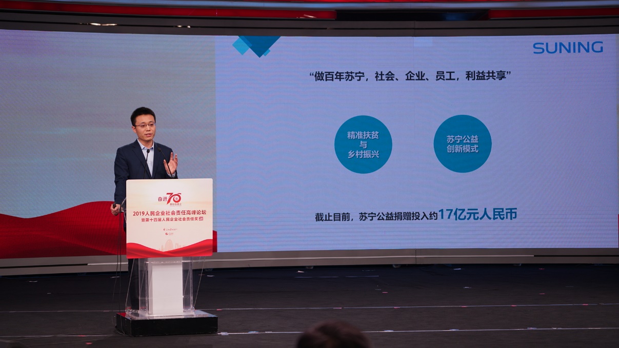深圳新聞網(wǎng)2019年12月31日訊 12月27日,2019人民企業(yè)社會責(zé)任高峰論壇暨第十四屆人民企業(yè)社會責(zé)任獎頒獎典禮在人民網(wǎng)舉行,各大企業(yè)代表分享經(jīng)驗。蘇寧榮獲第14屆人民企業(yè)社會責(zé)任獎“年度扶貧獎”獎項,表彰蘇寧在扶貧領(lǐng)域深入、專業(yè)的投入,這也是蘇寧第七次獲得人民企業(yè)社會責(zé)任獎。