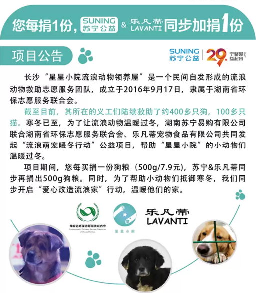 要說本次暖心活動最受關注的,還屬蘇寧線上線下聯(lián)動發(fā)起的“愛心狗糧7.9元捐”活動?;顒悠陂g,愛心人士只需要以7.9元的折扣價,在蘇寧易購線上購買一斤樂凡蒂狗糧就可完成捐贈。同時,蘇寧和樂凡蒂將加捐1斤。相當于7.9元捐贈兩斤狗糧。而這些愛心狗糧,將直接發(fā)往長沙“星星小院流浪動物領養(yǎng)屋”。