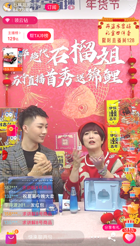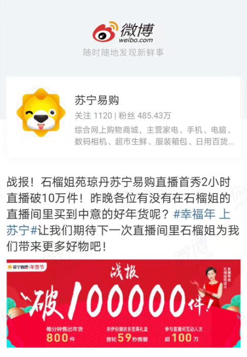 2020年伊始,“風(fēng)華絕代”的石榴姐苑瓊丹在蘇寧易購(gòu)開始了新年帶貨直播首秀,為全網(wǎng)用戶推薦實(shí)用年貨,超過100萬人“圍觀”了直播,兩小時(shí)帶貨超10萬件,平均每分鐘售出800件年貨,其中最受消費(fèi)者歡迎的來伊份潮吉多堅(jiān)果禮盒59秒售罄,創(chuàng)下2020年明星帶貨的新記錄!