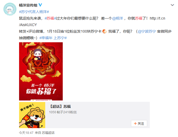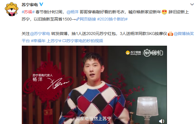 蘇寧代言人楊洋和江疏影也給大家?guī)?lái)了不少福利,粉絲們繼續(xù)喊話(huà)愛(ài)豆,“過(guò)年就差一個(gè)楊洋了,萬(wàn)一實(shí)現(xiàn)了呢”。蘇寧家電直接開(kāi)啟鼠運(yùn)來(lái)襲模式,粉絲參與微博互動(dòng),就有機(jī)會(huì)獲得2020元蘇寧紅包,還能獲得楊洋同款SKG按摩儀。