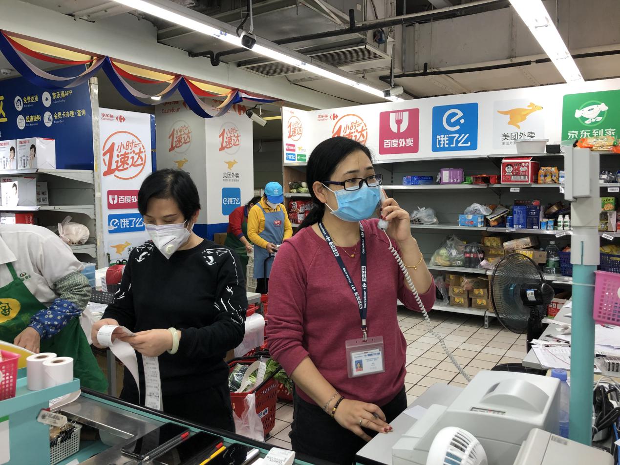 “最近十幾天,我們每天都要工作12個(gè)小時(shí)以上。”說(shuō)這話(huà)的正是家樂(lè)福深圳梅林店的電商主管王立華,由她帶領(lǐng)的5人小團(tuán)隊(duì)肩負(fù)起該店“配送到家”服務(wù)的揀貨、核單、打包、確認(rèn)、與騎手交貨等工作。疫情當(dāng)前為避開(kāi)人群,更多的市民選擇在線上外賣(mài)平臺(tái)訂購(gòu)超市的商品配送到家,因此超市的線上訂單猛增。為了實(shí)現(xiàn)“1小時(shí)速達(dá)”的承諾,避免訂單超時(shí),王立華要求團(tuán)隊(duì)從出單到打包好不能超過(guò)20分鐘,每天過(guò)手的各類(lèi)商品有上千件。“家樂(lè)福梅林店的賣(mài)場(chǎng)面積大概是5000平方米,每天上下樓跑多少趟具體倒是沒(méi)有統(tǒng)計(jì)過(guò),但像現(xiàn)在特殊時(shí)期,我們一天在網(wǎng)上接到的‘配送到家’服務(wù)訂單基本都要超過(guò)800單,有時(shí)候會(huì)到1000單?!蓖趿⑷A回答記者時(shí),額頭上一直有細(xì)密的汗珠,聲音也有點(diǎn)沙啞了。