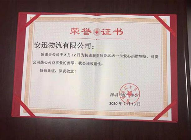 當?shù)絻商幘柚攸c收集好物資后,國美物流車輛到達深圳市疾控中心已是下午兩點多,一路上兩人水米未進,盡力保證捐贈物資的及時到位。深圳市紅十字會為國美安迅物流發(fā)來了榮譽證書,對他們及時運送愛心捐贈物資的善舉表示感謝。