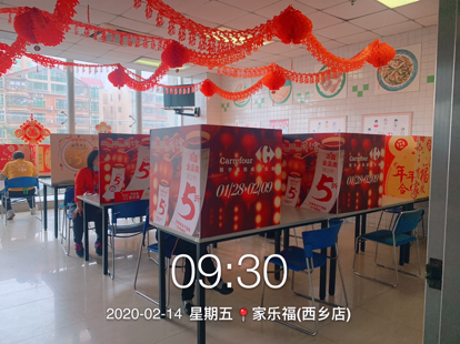 蘇寧家樂福還安排了保潔員每天對員工餐廳按三餐進行清潔,使用稀釋的84消毒液浸泡抹布對桌椅進行擦拭。其次,在餐廳放置免洗消毒凝膠,供員工用餐前清潔使用。再次,要求員工分時段用餐,自帶餐盒餐具盛飯;每個人在餐廳內(nèi)用餐是也要與他人保持一定距離,并用簡易卡板隔開。