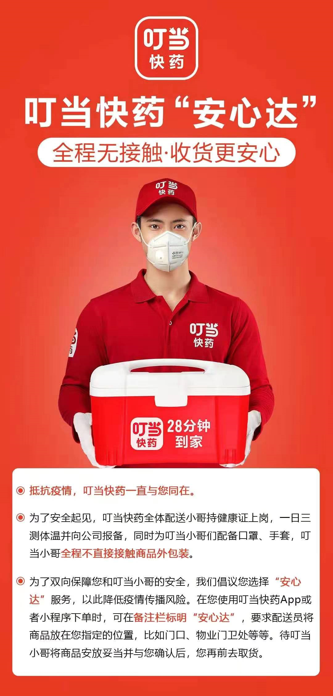 叮當快藥深圳負責人化先生還特意提醒市民,“為了雙向保障您和叮當小哥的安全,叮當快藥建議您選擇安心達服務,以此降低疫情傳播風險。在您使用叮當快藥App或者小程序下單時,可在備注欄標明“安心達”,要求配送員將商品放在您指定的位置,比如門口、物業(yè)門衛(wèi)處等。待叮當小哥將商品安放妥當并與您確認后,您再前去取貨”。