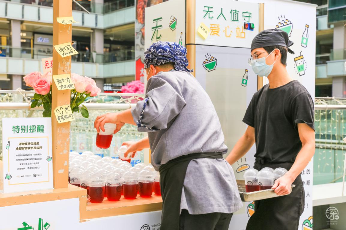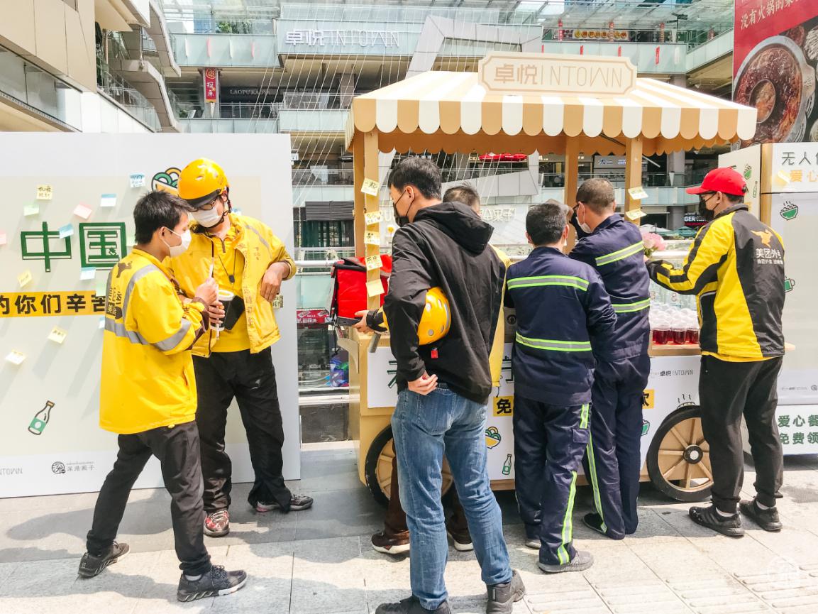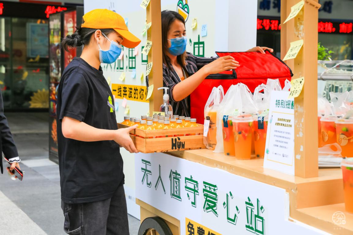 3月3日至3月8日卓悅INTOWN在街頭專設(shè)了一個(gè)”無(wú)人值守愛心站”,用愛心餐車上放滿了食物冷/熱飲,專門免費(fèi)贈(zèng)送給快遞、外賣小哥、環(huán)衛(wèi)工人、警察、城管等一線奔波的人員。