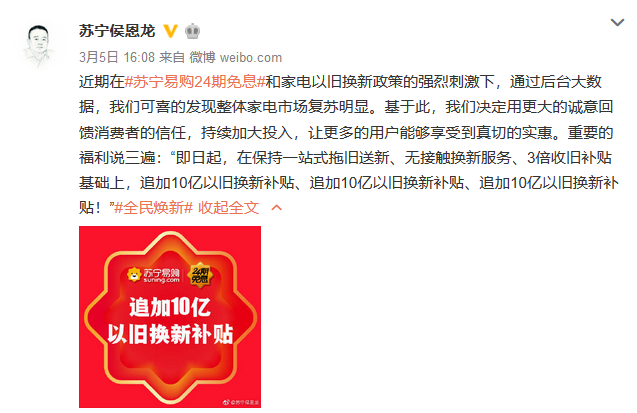 繼官宣24期免息政策后,蘇寧侯恩龍3月5日再發(fā)聲,微博表示將在315節(jié)點重磅加碼以舊換新業(yè)務,“即日起,在保持一站式以舊換新、無接觸換新服務、3倍收舊補貼基礎上,追加10億以舊換新補貼”。
