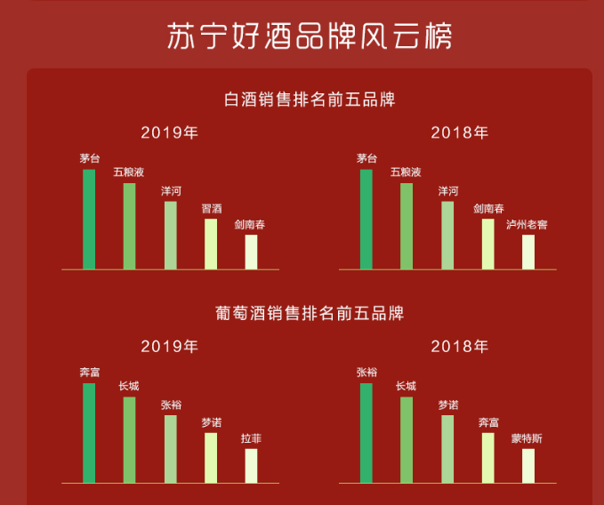 對(duì)比2018年各品牌在蘇寧的銷售表現(xiàn),則是穩(wěn)坐釣魚(yú)臺(tái)的品牌有之,長(zhǎng)江后浪推前浪的品牌有之。具體來(lái)說(shuō),茅臺(tái)、五糧液、洋河一直牢牢占據(jù)白酒品類銷售榜前三。在紅酒方面,奔富后來(lái)者居上,從2018年的第四位躍居第一位。啤酒方面,雪花、哈爾濱、青島、百威、福佳的排名無(wú)變動(dòng),而洋酒方面,馬爹利一直穩(wěn)坐第一。古越龍山也一直是黃酒品牌銷售top1。