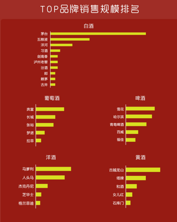 具體來(lái)說(shuō),從蘇寧超市公布的品牌銷售規(guī)模排行榜來(lái)看,茅臺(tái)、五糧液、洋河、習(xí)酒、劍南春、瀘州老窖、汾酒、郎酒、賴茅、古井成為當(dāng)之無(wú)愧的白酒品類銷售top10品牌。奔富、長(zhǎng)城、張?jiān)!?mèng)諾、拉菲則成功問(wèn)鼎葡萄酒銷售top5,雪花、哈爾濱、青島、百威、福佳在啤酒品類中銷售表現(xiàn)最好。馬爹利、古越龍山則分別成為洋酒、黃酒品類銷售冠軍。