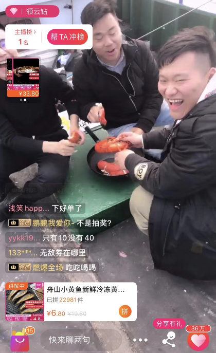 一旁直播的尹鴻狀態(tài)正好,從剛開(kāi)播到現(xiàn)在,直播間的人數(shù)嗖嗖往上竄,不一會(huì)便聚集了十幾萬(wàn)圍觀群眾。搖晃的直播鏡頭,更具真實(shí)感,似乎把觀眾帶到了船上一般。尹鴻馬不停蹄在船上踱步,給觀眾介紹各種海鮮小知識(shí),并大力吆喝起這次直播主打的兩款產(chǎn)品:深海小黃魚(yú)和舟山帶魚(yú)?!拔覀兲K寧拼購(gòu)的海產(chǎn)品都是從張老大這樣漁民手中收來(lái)的,下單直發(fā),眼見(jiàn)為實(shí)?!?/p>