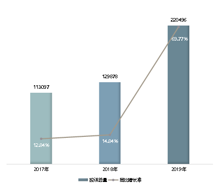 2019年全年深圳市消費(fèi)者委員會(huì)(以下簡稱“深圳市消委會(huì)”)共收到220496宗投訴,同比增長69.77%,增速約為2018年同比增長率的4.7倍,接近2017年與2018年投訴量總和。(見圖1)