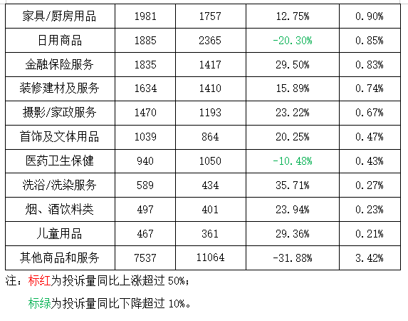 從投訴量變化情況來看,互聯(lián)網(wǎng)及通信行業(yè)服務(wù)、文體旅游服務(wù)、教育培訓(xùn)及化妝品/美容美發(fā)/整形四個(gè)行業(yè)投訴量同比增長超過50%;公共設(shè)施服務(wù)、日用商品、服裝鞋帽以及醫(yī)藥衛(wèi)生保健四個(gè)行業(yè)投訴量同比下降超過10%。其中公共設(shè)施服務(wù)類的減幅最大,為38.29%,主要原因?yàn)楣蚕沓鲂行袠I(yè)洗牌,部分企業(yè)退出市場,投訴量隨之下降。