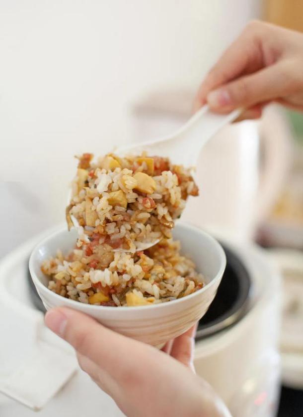 5.米飯煮熟后,把炒好的料倒入電飯煲中,翻拌均勻,再次蓋上蓋,用電飯煲保溫燜10分鐘。即可出鍋享用啦。