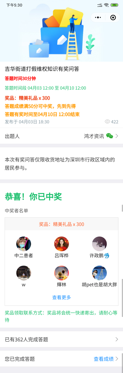 有獎問答活動從消費者日常消費維權(quán)出發(fā),結(jié)合《消費者權(quán)益保護法》,采取線上答題的形式進行,其濃厚的趣味性和知識性吸引了轄區(qū)廣大居民的熱情參與,收到了良好的活動效果。據(jù)統(tǒng)計,累計約360余人參與答題,滿分率高達45%,共送出禮品300份。為避免疫情防控期間人員密切接觸,本次禮品全部郵寄到家,方便居民領(lǐng)取。