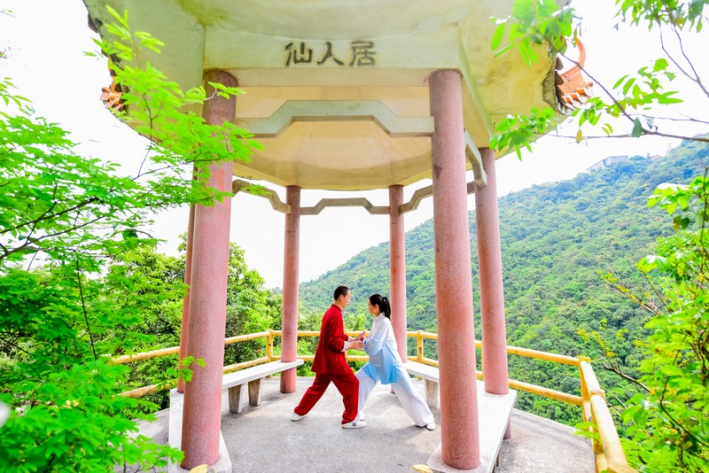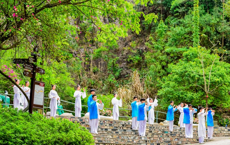 林海之間,清音回蕩,視野秀美的“八仙過(guò)?!迸?,曲徑通幽的“仙人居”中,山巖之邊,有視野秀美之景,與太極拳的安靜自然、細(xì)膩綿柔、以柔克剛相得益彰;男女剛?cè)嵬剖中紊窦鎮(zhèn)?,融心于景;太極功夫扇展示中,渾厚的開(kāi)扇聲在空中回響,為登山之旅增添了一抹濃厚的色彩。