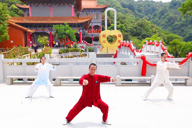 登上山巔,鴻幅祥瑞的天下第一福前,群體太極隨著古曲起勢(shì),他們動(dòng)作輕盈、身形矯健,把太極拳柔韌纏絲、松活彈抖的節(jié)奏美和力量美表現(xiàn)得淋漓盡致,不少觀眾看到太極拳展示都拍手叫好。在綿延而伸的三寶路、清幽靜謐的雅清苑、吉祥苑的亭臺(tái)小榭中,太極習(xí)練者在樹(shù)影搖曳、微風(fēng)徐徐的自然中站立,悠揚(yáng)的古曲似流水緩緩流灑,一個(gè)個(gè)飄飄然的身影沉肩墜肘、輾轉(zhuǎn)騰挪,在一呼一吸的節(jié)奏中,不知不覺(jué)便將心沉浸在山水交融、天人合一的境界中。此外,更有小萌娃著太極服現(xiàn)場(chǎng)“過(guò)招”,“大展拳腳”,與身邊青翠風(fēng)景相映成畫(huà),圍觀游客紛紛用手機(jī)留下這圈粉的身影。其中一位家長(zhǎng)介紹,小朋友從小和爺爺學(xué)習(xí)太極,為了強(qiáng)身健體,也是興趣使然,觀音山森林環(huán)境良好,久宅在家?guī)Ш⒆幼叱黾议T(mén)打打太極,呼吸新鮮空氣,有益身心狀態(tài)的調(diào)節(jié)。