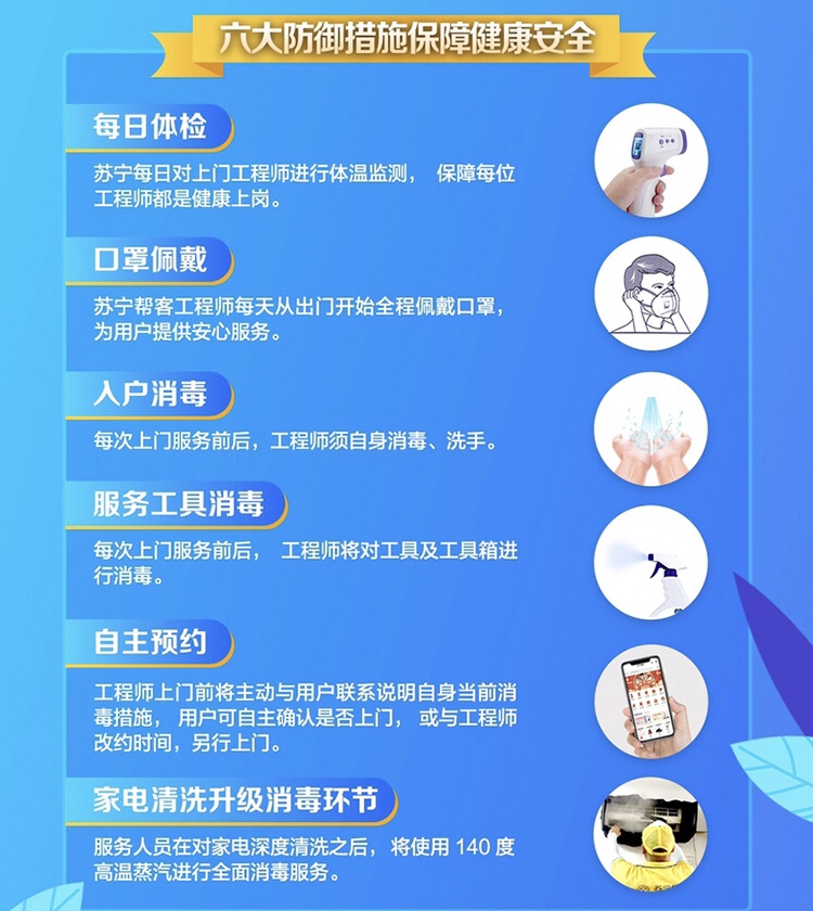 據了解,該承諾卡是蘇寧創(chuàng)建,主要承諾內容包括服務前的體溫檢測、工具消毒、個人防護;服務中的工程師全防護、工具不落地、與用戶保持安全距離;服務后的機器清潔、線上保修減少上門以及清理服務現場。