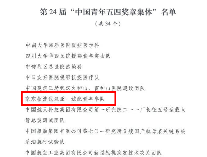 面對突如其來的新冠肺炎疫情,廣大青年在各行業(yè)、各領(lǐng)域履職盡責(zé)、團(tuán)結(jié)奮斗,積極投身防控工作一線,為保持經(jīng)濟(jì)平穩(wěn)發(fā)展和社會和諧穩(wěn)定作出了突出貢獻(xiàn),今年的中國五四青年獎?wù)滦略隽丝挂哳惇勴椩u選。在公布的34個集體類獲獎名單中,京東物流武漢亞一城配青年車隊是唯一來自物流行業(yè)的集體。