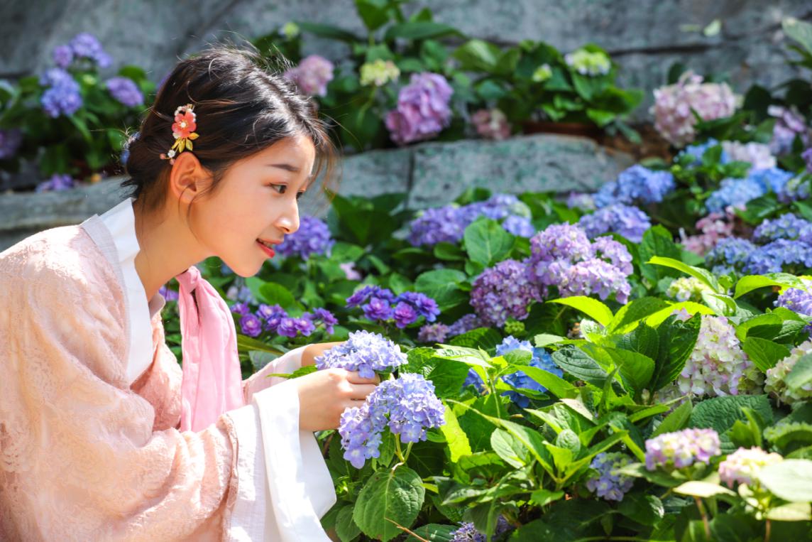 踏青時節(jié),觀音山上林海青翠欲滴,勒杜鵑伴著游人的旅途,成為了一抹抹明艷的色彩。在這山花爛漫的美景中,觀音山上繡球花正成片綻放,成為入園游客踏青游的意外驚喜,唯美成簇開放的繡球花也吸引了不少漢服愛好者前來采風,一睹唯美浪漫的花“繡”。景區(qū)內,上山步道旁,彩繪逼真的白鶴相伴,林蔭之下,簇擁成團的花團姿容端莊,時而明艷時而清麗,漢服美女倩影相隨,淡雅素凈之色讓經(jīng)過的游人沉醉其中;雅清苑中,“一身素袍”的繡球與古香古色的亭臺小榭交相輝映,古樸、幽靜的晚春畫卷緩緩打開;鵲橋之下,瀑布潺潺,帶著微微的水汽,落在繡球小花的瓣上,靈動又活潑,映證著希望、健康、忠貞、美滿、團聚的美好寓意。據(jù)了解,繡球花期在五一假期期間正值絕佳觀賞花期,將迎來賞花高峰期,不少網(wǎng)友留言點贊:“繡球花和漢服小姐姐的古韻氣質相襯,把觀音山的山水襯得更清新唯美了,五一一定要來打卡。”
