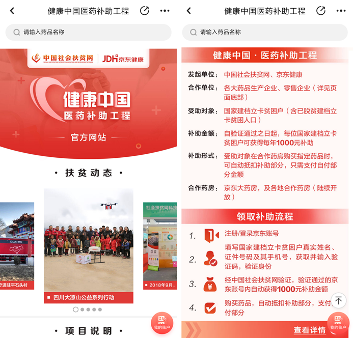 在中國扶貧志愿服務(wù)促進(jìn)會(huì)指導(dǎo)下,依托中國社會(huì)扶貧網(wǎng),“健康中國?醫(yī)藥補(bǔ)助工程”將對(duì)全國貧困人口身份信息精準(zhǔn)識(shí)別,確定受助對(duì)象,京東健康將為受助對(duì)象每人每年提供1000元藥品補(bǔ)助資金,受助對(duì)象在指定渠道購買補(bǔ)助目錄內(nèi)藥品時(shí)即可使用。