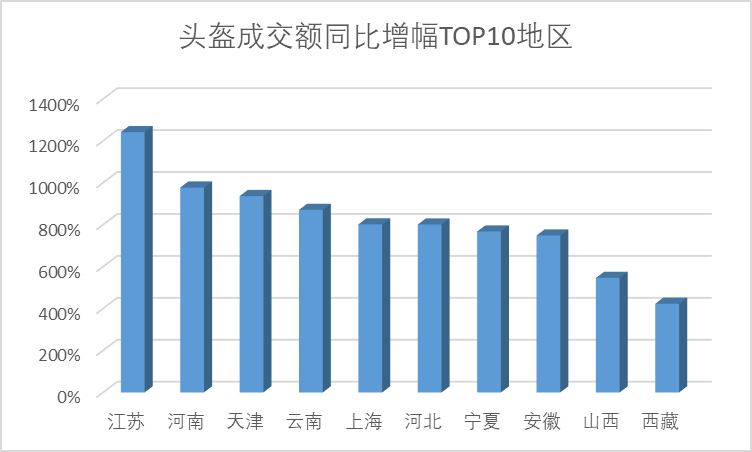 頭盔取得高速增長(zhǎng)的同時(shí),摩托車、電動(dòng)車的成交額增幅也分別超過(guò)110%和50%。寧夏、北京、甘肅、陜西等地區(qū)摩托車成交額同比增幅較高,而西藏、北京、寧夏、甘肅等地區(qū)的電動(dòng)車成交額同比增幅較高。