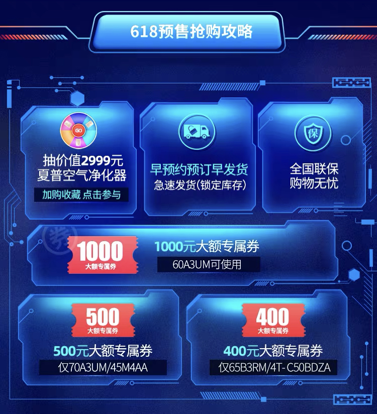 本消費者參與預付,100元定金膨脹最高達1.5倍,滿滿誠意助力預售。此外若消費者參與搶先付定,還能獲得最高價值1199元的專屬大禮包,包含從夏普音響到優(yōu)酷年卡在內(nèi)7重好禮助力預售!優(yōu)惠之外,夏普還驚喜設置加購收藏環(huán)節(jié),消費者參與抽獎即有機會獲得高達2999元的超實用夏普空氣凈化器。更多大促信息可前往天貓夏普官方旗艦店了解詳盡618預售搶購攻略。