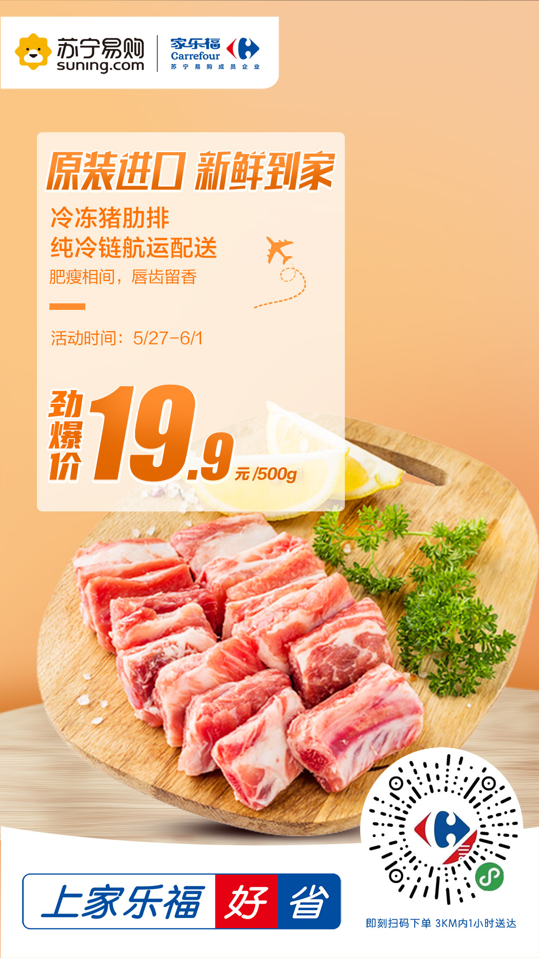 進(jìn)口冷凍豬肋排是本次活動(dòng)的主推爆品之一。生豬按照歐盟標(biāo)準(zhǔn)養(yǎng)殖,采用非轉(zhuǎn)基因飼料喂養(yǎng),全程不使用抗生素,原廠精切,采用純冷鏈航運(yùn)配送,全程可溯源。肥瘦相間,讓人唇齒留香。豬肉價(jià)格高企的背景下,這款進(jìn)口豬肋排原價(jià)39.9元/500g,活動(dòng)期間僅售19.9元/500g,價(jià)格十分惠民,絕對(duì)是秒殺爆品。此外,家樂(lè)福還準(zhǔn)備了澳洲黃牛肉36.8元/斤、帶皮后腿肉19.9元/斤、小龍蝦19.9元/盒、波士頓龍蝦+三文魚的組合預(yù)售。誠(chéng)意滿滿,只為滿足“食肉獸”的大胃口!