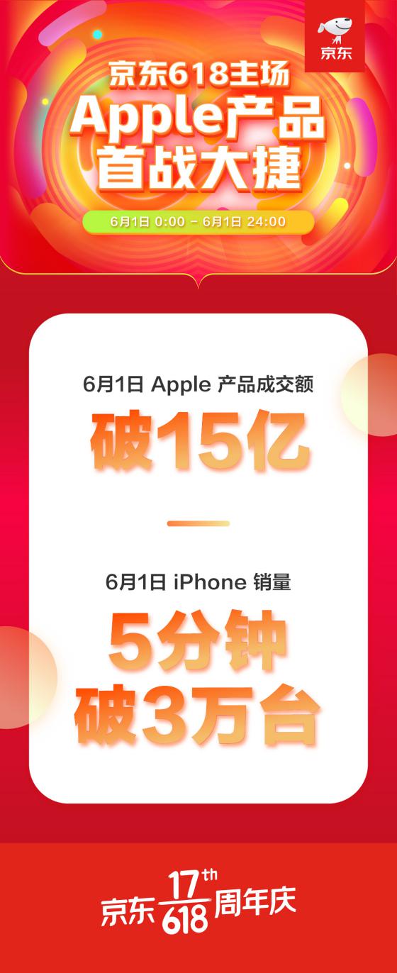 京東618開啟首日,Apple品牌接連創(chuàng)下銷售記錄:僅5秒銷售額就突破1億;5分鐘后,iPhone銷量突破3萬臺;全天成交金額達(dá)到15億。