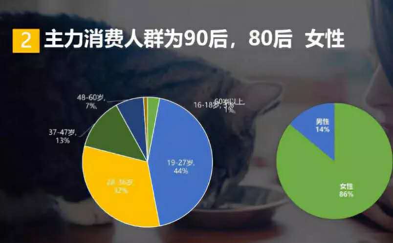 阿里巴巴利用線上平臺(tái)的數(shù)據(jù)給養(yǎng)寵人群畫了一個(gè)像,他們的主力軍是年輕人,其中80后與90后占比是70%,本科學(xué)歷占比達(dá)到50%,58%是女性。有意思的是從增長的幅度來看,男性養(yǎng)寵的增長速度最快,在過去一年增長了10%。