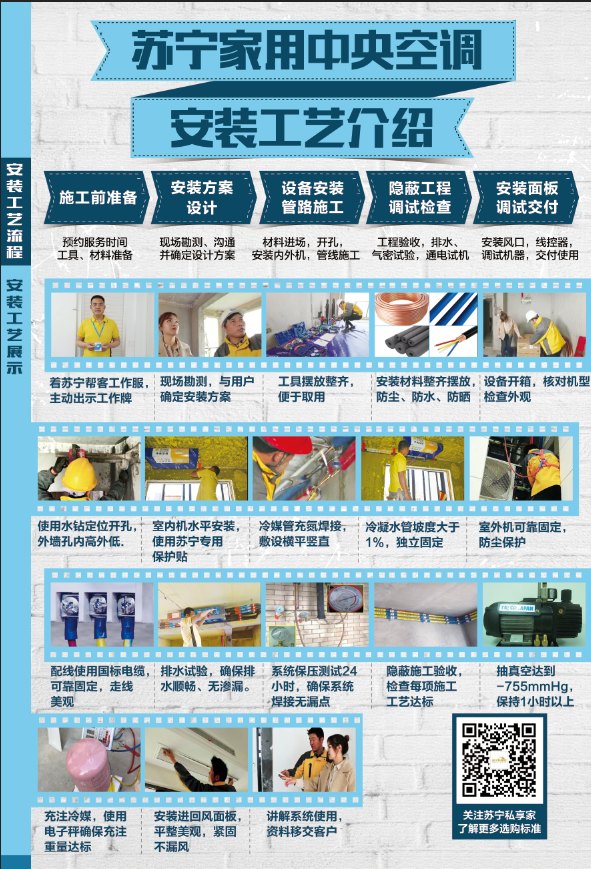 蘇寧中央空調(diào)以《安裝綠寶書(shū)》的形式,從“人、材、技”三方面規(guī)定蘇寧施工“365標(biāo)準(zhǔn)”,細(xì)致展示了蘇寧中央空調(diào)的施工流程和具體工藝,包括安裝工程師的職業(yè)行為、施工現(xiàn)場(chǎng)的規(guī)范、安裝工具的要求、安裝材料的標(biāo)準(zhǔn),以及整個(gè)安裝過(guò)程的嚴(yán)苛工藝標(biāo)準(zhǔn)和調(diào)試環(huán)節(jié)等諸多方面。五大工序,涉及18個(gè)步驟,為消費(fèi)者全面解讀中央空調(diào)標(biāo)準(zhǔn)化施工的“秘密”。