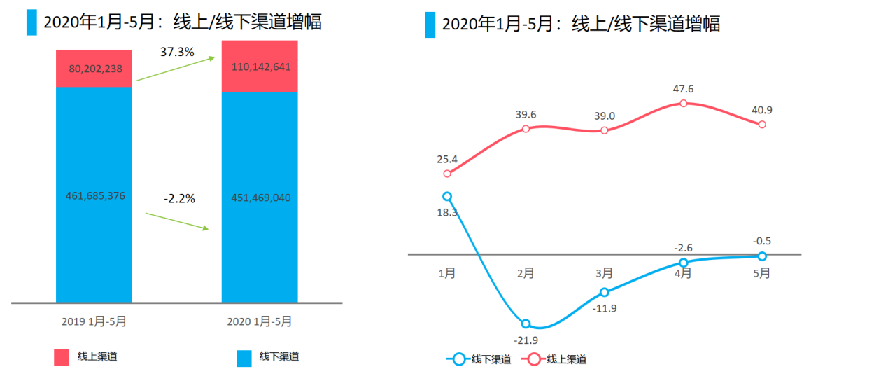 通過尼爾森監(jiān)測的市場數(shù)據(jù)發(fā)現(xiàn),在2019年快消品市場1.3萬億的總銷售額中,線下市場增速放緩2019年增速為4%,而線上市場增速超過30%。疫情初期,很多線下實體商店無法營業(yè),讓原本線下市場呈現(xiàn)下降趨勢;各品類廠商為了解決困境,紛紛拓展線上渠道。