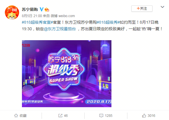 見(jiàn)圳客戶端·深圳新聞網(wǎng)2020年8月6日訊 昨晚,蘇寧易購(gòu)官方微博發(fā)布消息稱,8月17日19:30,蘇寧易購(gòu)30周年818超級(jí)秀將登陸東方衛(wèi)視。