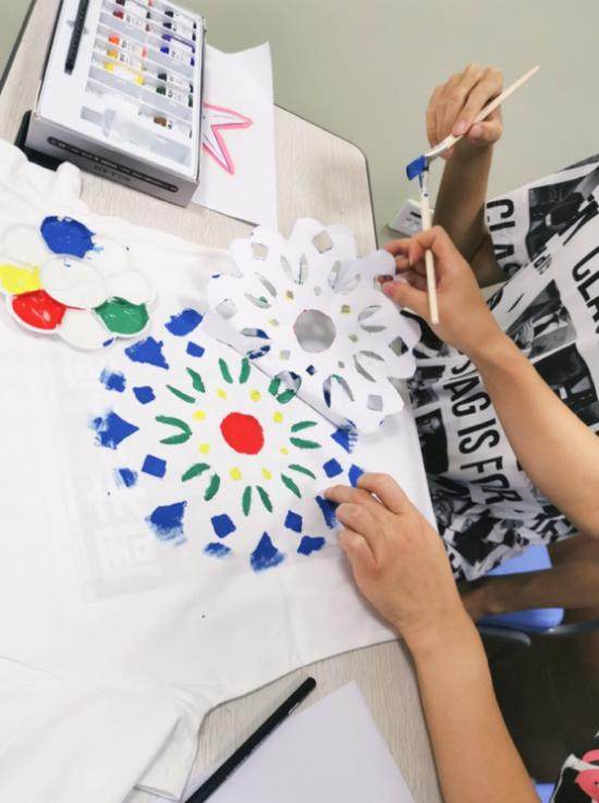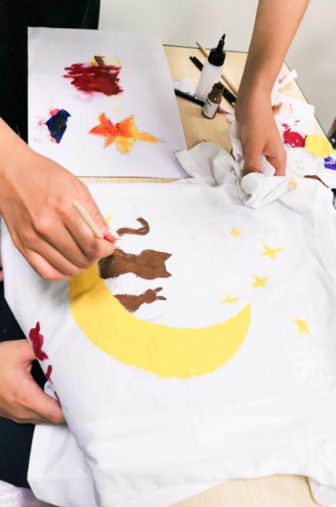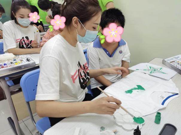 小星星們?cè)诳祻?fù)中心接受系統(tǒng)的康復(fù)訓(xùn)練,平時(shí)也有音樂課、美術(shù)課,不過在T恤上涂鴉還是第一次。星星是什么顏色的呢?在這些特殊的孩子心中都有自己的答案。10位志愿者小姐姐一對(duì)一陪坐在孩子們身邊,以前她們學(xué)習(xí)色彩知識(shí)是為了提升專業(yè)能力,而這次是用色彩開啟小星星們的好奇和想象,用色彩的力量點(diǎn)亮他們的小小世界,一起感知愛、表達(dá)愛,傳遞愛,為愛填上溫暖的底色?!斑@些孩子們很喜歡畫畫,畫畫應(yīng)該是他們溝通世界的另外一種語言?!毙切强祻?fù)中心的老師說。
