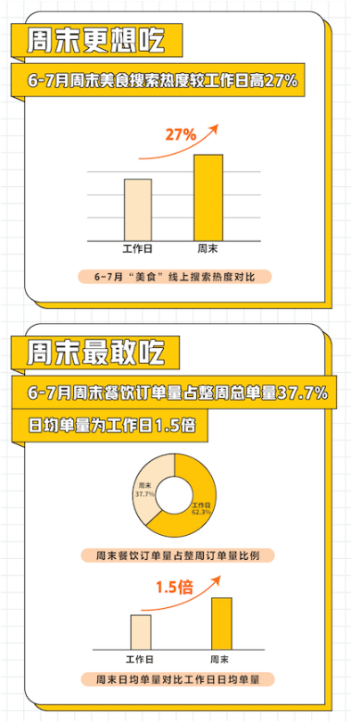 據(jù)美團(tuán)點(diǎn)評(píng)餐飲學(xué)院發(fā)布的《2020周末餐飲堂食消費(fèi)趨勢洞察》顯示,疫情恢復(fù)期,餐飲堂食消費(fèi)活力回歸,周末餐飲消費(fèi)對(duì)整個(gè)餐飲市場復(fù)蘇助力明顯。美團(tuán)6-7月線上美食搜索熱度中,周末的搜索熱度較工作日高出27%;周末餐飲線上訂單量占整周總單量的37.7%,日均單量為工作日的1.5倍。周末餐飲消費(fèi)拉動(dòng)經(jīng)濟(jì)復(fù)蘇,正在成為驅(qū)動(dòng)消費(fèi)的新引擎。