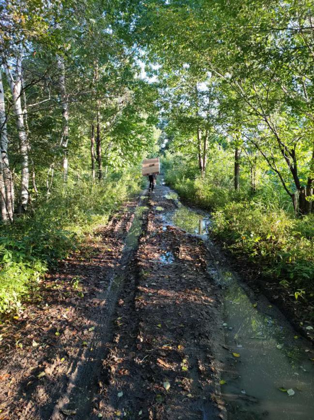 一路開下來(lái),車身濺起不少泥垢。快到目的地時(shí),一段泥濘的林間小路攔住了王能的去路。原來(lái),道路積水過(guò)多,泥土過(guò)軟,車輛不能前行。王能隨即將車??吭诼愤?,直接卷上褲腿,扛起電視前行。兩公里的林間路,本就不輕松,扛著電視更是“難上加難”。