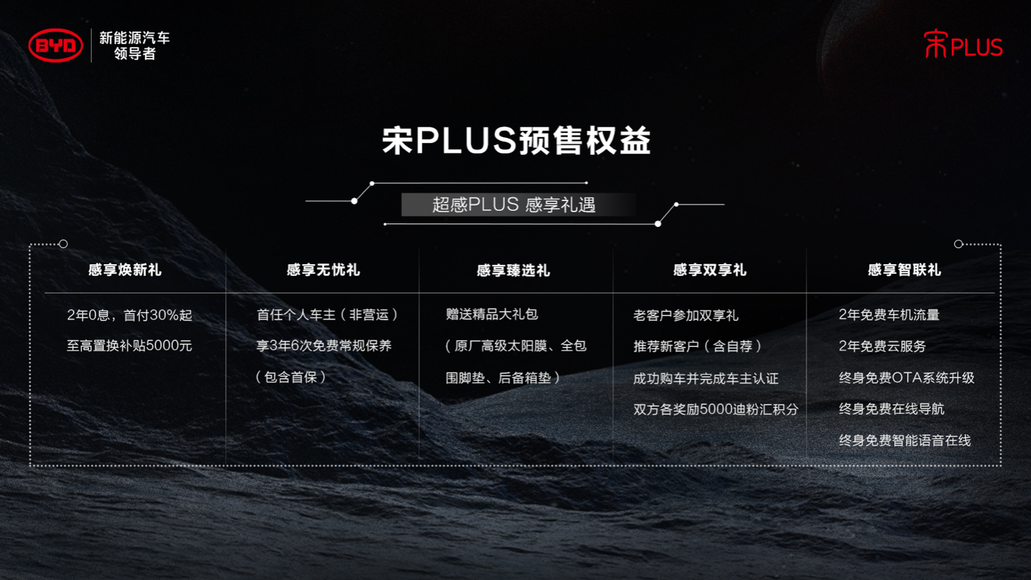 即將于九月上市的宋 PLUS,是比亞迪繼漢之后于今年推出的第二款重磅車型。作為一款 B級(jí) SUV車型, TA填補(bǔ)了宋 P ro與唐之間的車型空白,憑借其越級(jí)品質(zhì)直擊中高端 SUV市場(chǎng)。新車以充滿高級(jí)感的全新設(shè)計(jì),更具質(zhì)感的越級(jí)駕乘體驗(yàn),滿足了消費(fèi)者更加多元化的用車升級(jí)需求。而11.88萬(wàn)元 -14.68萬(wàn)元的預(yù)售價(jià)格,將成為15萬(wàn)級(jí)S UV價(jià)值首選。即日起到比亞迪各銷售服務(wù)店預(yù)訂,即可享受“2年0息,首付30%起、至高置換補(bǔ)貼5000元”等感享五重好禮。搶先掃碼二維碼,驚喜多多不容錯(cuò)過(guò)。(張俊達(dá))