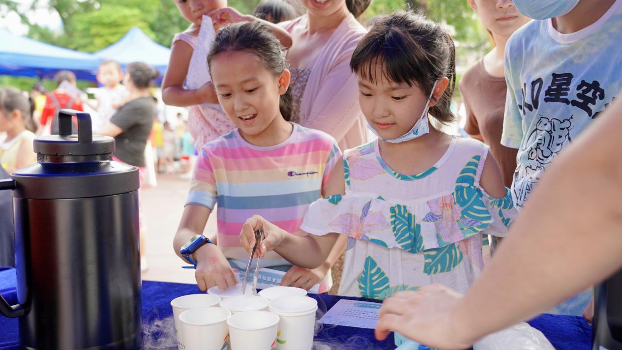 杯子里的干冰劇烈翻滾著,白色的煙霧一團團冒出,轄區(qū)居民好奇的看著劇烈升騰的煙霧。“神奇嗎?這就是干冰的升華現(xiàn)象”在“科學干冰秀”區(qū)域,工作人員邊演示邊為居民講解干冰升華原理。