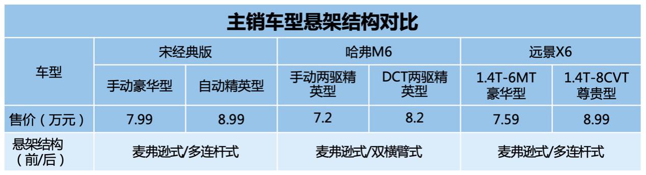 宋經(jīng)典版不僅擁有堪稱同級最佳的動力系統(tǒng),媲美德系豪車的底盤是它的另一優(yōu)勢。從懸架結(jié)構(gòu)來看,三車的前懸架均為麥弗遜獨立式,宋經(jīng)典版與遠(yuǎn)景X6的后懸架為多連桿獨立式,哈弗M6則為結(jié)構(gòu)更為簡單的雙橫臂式。如果說設(shè)計賦予一輛車生命,調(diào)校則賦予一輛車靈魂。宋經(jīng)典版的懸架由前奔馳S級底盤專家漢斯·柯克精心打磨。在調(diào)校過程中,甚至連輪胎的匹配都被充分考慮,歷經(jīng)多輪共計數(shù)百組方案匠心調(diào)校,兼顧舒適與運動的雙重需要。