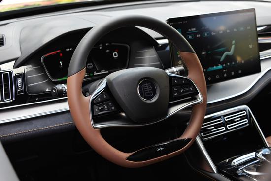 2021款唐DM使用了全新設(shè)計的雙幅方向盤,雙色方向盤上方為黑色,下方為棕色(赤兔棕),與內(nèi)飾整體布局非常契合,同時也增加了豪華感。另外方向盤上的裝飾件處理與中控臺材質(zhì)相同。