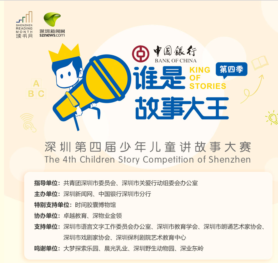 “誰是故事大王·第四季”活動由共青團(tuán)深圳市委員會、深圳市關(guān)愛行動組委會辦公室指導(dǎo),深圳新聞網(wǎng)、中國銀行深圳市分行聯(lián)合主辦,卓越教育、深物業(yè)金領(lǐng)協(xié)辦,活動還得到了時間膠囊博物館、大夢探索樂園的特別支持。