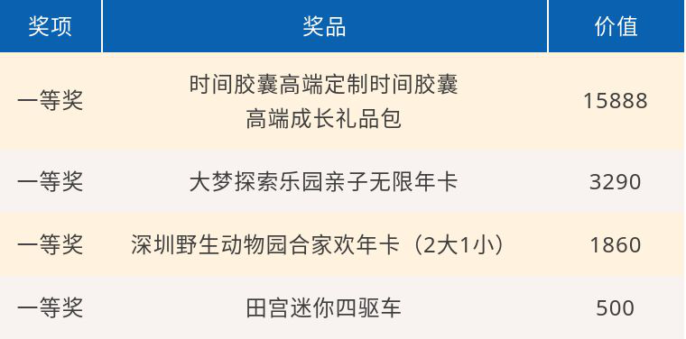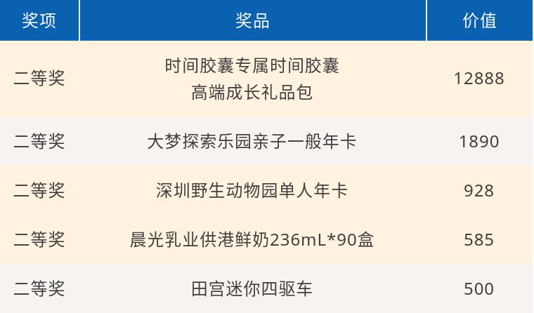 贏得二等獎的參賽者可獲得“時間膠囊專屬時間膠囊高端成長禮品包”“大夢探索樂園親子一般年卡”“深圳野生動物園單人年卡”“田宮迷你四驅(qū)車”以及一季度的“晨光乳業(yè)供港鮮奶”等獎品。