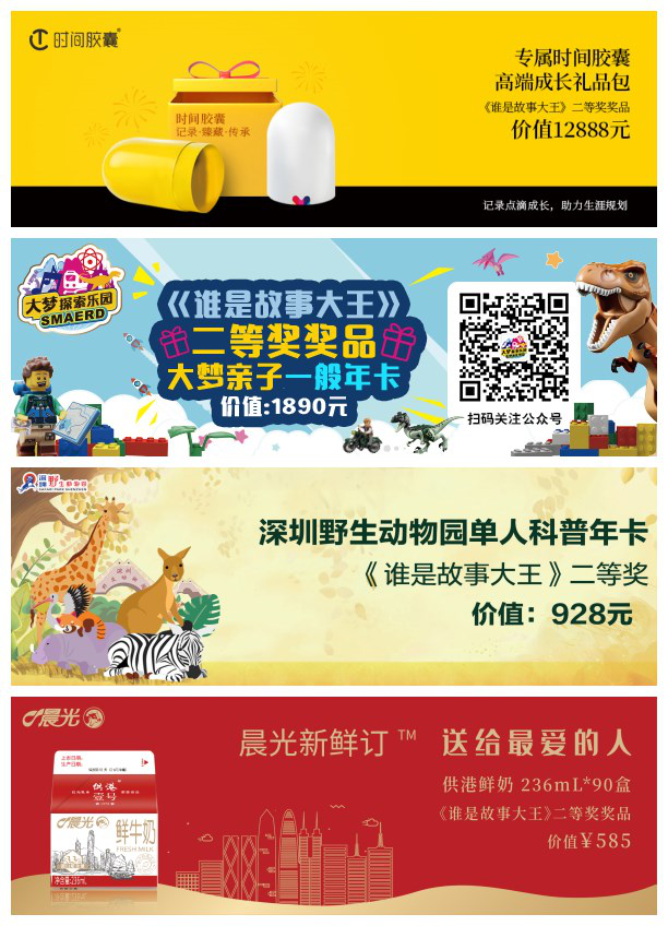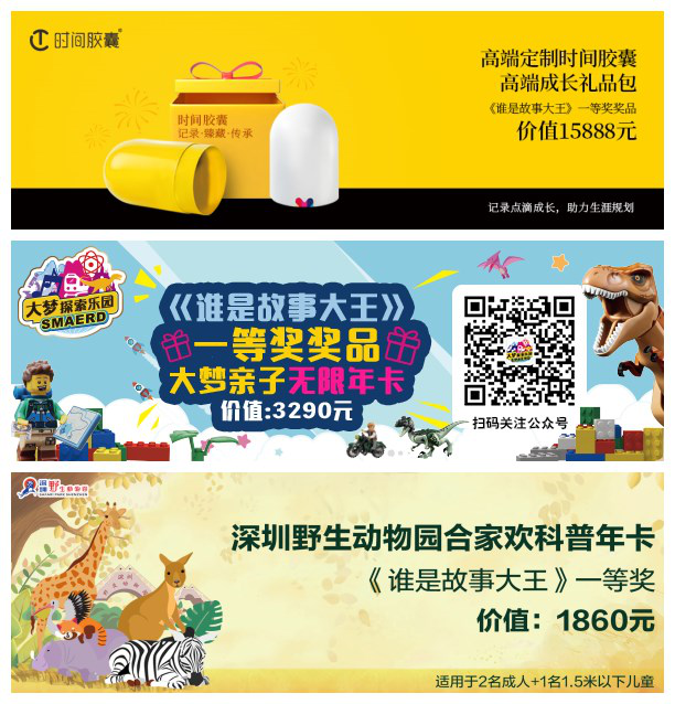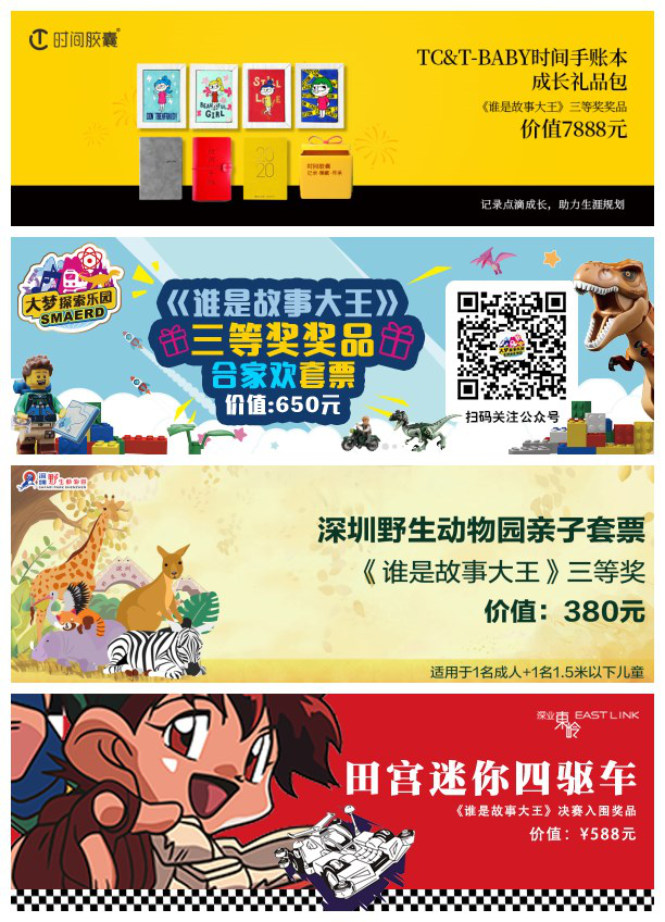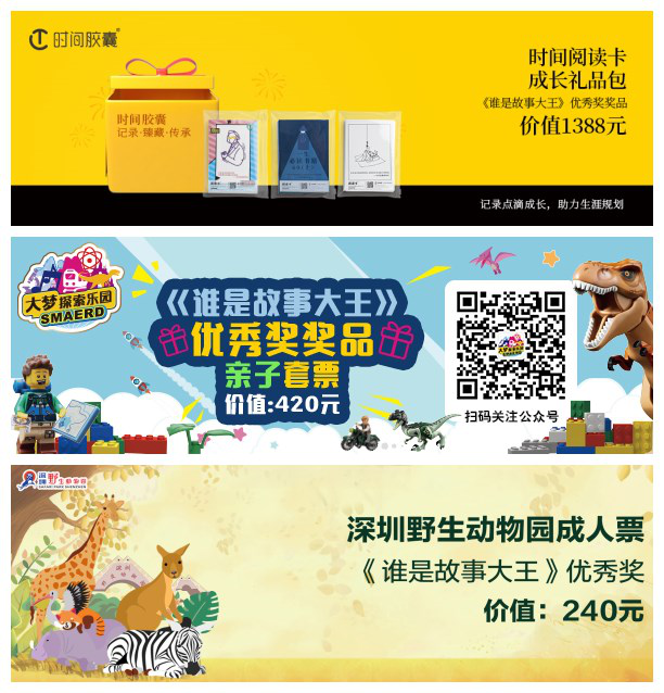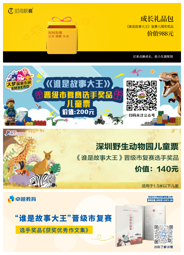 通往“故事大王”的路上,還有更多豪禮領(lǐng)取,優(yōu)秀選手將在主流權(quán)威媒體進行風(fēng)采展示。今年的“誰是故事大王·第四季”小中組與小高組的比賽將評選出兩位一等獎(即“故事大王”)、六位二等獎,十二位三等獎及二十位優(yōu)秀獎獲得者。其中,“故事大王”的獲得者可贏取“時間膠囊高端定制時間膠囊高端成長禮品包”“大夢探索樂園親子無限年卡”“深圳野生動物園合家歡年卡”和“田宮迷你四驅(qū)車”等萬元豪禮。